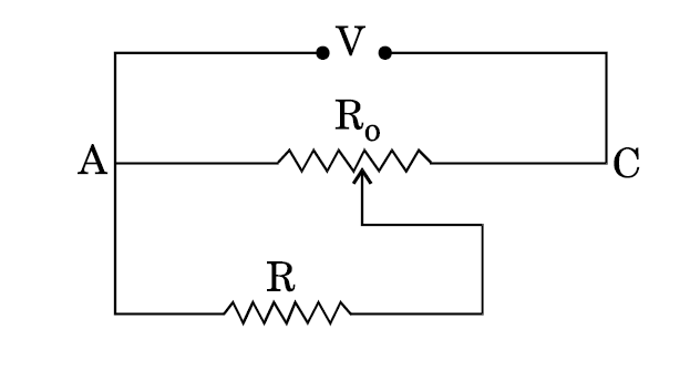 A resistance of $R \Omega$ draws current from a potentiometer as shown in the figure. The potentiometer has a total resistance $R_o\Omega$ . A voltage $V$ is supplied to the potentiometer. Derive an expression for the voltage across $R$ when the sliding contact is in the middle of the potentiometer.