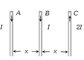 $A, B$ and $C$ are parallel conductors of equal length carrying currents $I, I$ and $2I$ respectively. Distance between $A$ and $B$ is $x$. Distance between $B$ and $C$ is also $x$. ${F_1}$ is the force exerted by $B$ on $A$ and $F_2$ is the force exerted by $B$ on $A$ choose the correct answer