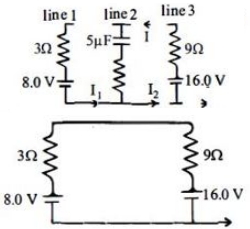 The circuit shown here has two batteries of $8.0\,V$ and $16.0\,V$ and three resistors $3\,\Omega ,\,9\,\Omega $ and $9\,\Omega $ and a capacitor of $5.0\,\mu F.$