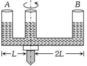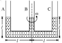 Figure shows a three arm tube in which a liquid is filled upto levels of height $l$. It is now rotated at an angular frequency $\omega$ about an axis passing through arm $B$. The angular frequency $\omega$ at which level of liquid in arm $B$ becomes zero.