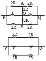 $\therefore $ $\frac{1}{\mathrm{R}_{\mathrm{PQ}}}=\frac{1}{4 \mathrm{R}}+\frac{1}{4 \mathrm{R}}+\frac{1}{2 \mathrm{r}}$ $=\frac{1}{2 \mathrm{R}}+\frac{1}{2 \mathrm{r}}$ $=\frac{\mathrm{R}+\mathrm{r}}{2 \mathrm{Rr}}$