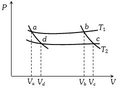 In the following $P-V$ diagram two adiabatics cut two isothermals at temperatures $T_1$ and $T_2$ (fig.). The value of $\frac{{{V_a}}}{{{V_d}}}$ will be