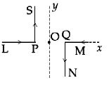 As shown in the figure, two infinitely long, identical wires are bent by $90^o$ and placed in such a way that the segments $LP$ and $QM$ are along the $x-$ axis, while segments $PS$ and $QN$ are parallel to the $y-$ axis. If $OP = OQ = 4\, cm$, and the magnitude of the magnetic field at $O$ is $10^{-4}\, T$, and the two wires carry equal current (see figure), the magnitude of the current in each wire and the direction of the magnetic field at $O$ will be $(\mu_ 0 = 4\pi \times10^{-7}\, NA^{-2})$