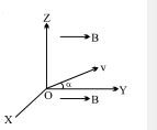 In a region of space, a uniform magnetic field $B$ exists in the $y-$direction.Aproton is fired from the origin, with its initial velocity $v$ making a small angle $\alpha$ with the $y-$ direction in the $yz$ plane. In the subsequent motion of the proton,