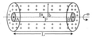 A thick uniformly charged hollow cylinder of inner radius $a$ and outer radius $b$ rotates with constant angular speed $\omega $ about its axis $APB$, charge density$ = \rho $