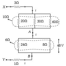 Current between $A$ and $B$ = Current between $X$ and $Y$ $ = i = \frac{{48}}{6} = 8\,A$