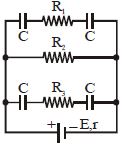 In the circuit diagram of figure, $E = 5\, volt, r = 1\, \Omega ,$$ R_2 = 4\, \Omega , R_1 = R_3 = 1 \Omega$ and $C = 3\, μF.$ Then the magnitude of the charge on each capacitor plate is......$\mu C$