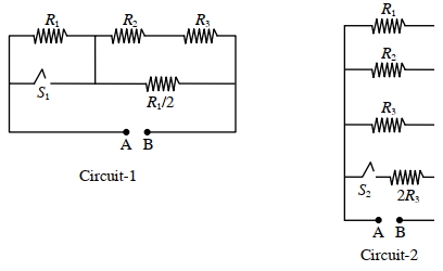 $(A)$ When a voltage source of $6 V$ is connected across $A$ and $B$ in both circuits, $P_1$