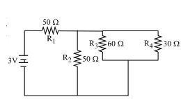 In the circuit shown, the resistances are given in ohms and the battery is assumed ideal with $\mathrm{emf}$ equal to $3.0$ $\mathrm{volts}.$ The resistor that dissipates the most power is