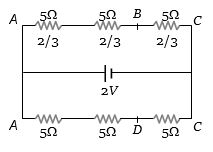 For identical resistances, potential difference distributes equally among all. Hence potential difference across each resistance is $\frac{2}{3}\,V,$ and potential difference between $A$ and $B$ is $\frac{4}{3}\,V.$