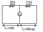 The resistance per centimeter of a meter bridge wire is $\mathrm{r}$, with $\mathrm{X}\ \Omega$ resistance in left gap. Balancing length from left end is at $40 \mathrm{~cm}$ with $25\ \Omega$ resistance in right gap. Now the wire is replaced by another wire of $2 \mathrm{r}$ resistance per centimeter. The new balancing length for same settings will be at