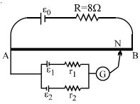 $A$ battery of $\mathrm{emf}$ $E_0 = 12\, V$ is connected across a $4\,m$ long uniform wire having resistance $4\,\Omega /m$. The cells of small $\mathrm{emfs}$ $\varepsilon_1 = 2\,V$ and $\varepsilon_2 = 4\,V$ having internal resistance $2\Omega$ and $6\Omega$ respectively, are connected as shown in the figure. If galvanometer shows no deflection at the point $N$, the distance of point $N$ from the point $A$ is equal to