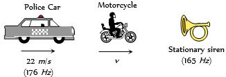 A police car moving at $22 m/s$, chases a motorcyclist. The police man sounds his horn at $176 Hz$, while both of them move towards a stationary siren of frequency $165 Hz$. Calculate the speed of the motorcycle, if it is given that he does not observes any beats .... $m/s$