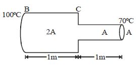 A metal rod of length $2\, m$ has cross-sectional areas $2A$ and $A$ as shown in the following figure. The two ends are maintained at temperatures $100\,^oC$ and $70\,^oC$. The temperature of middle point $C$ is ........ $^oC$