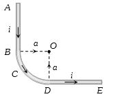 d (d) The field at $O$ due to $AB$ is $\frac{{{\mu _0}}}{{4\pi }}.\frac{i}{a}\hat k$ and that due to $DE$ is also $\frac{{{\mu _0}}}{{4\pi }}.\frac{i}{a}\hat k$.