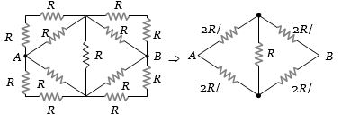 Thirteen resistances each of resistance $R\, ohm$ are connected in the circuit as shown in the figure below. The effective resistance between $A$ and $B$ is