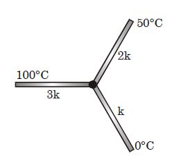 Three rods of the same dimensions have thermal conductivities $3k, 2k$ and $k$. They are arranged as shown, with their ends at $100\,^oC, 50\,^oC$ and $0\,^oC$. The temperature of their junction is