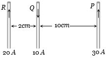 Three long, straight and parallel wires carrying currents are arranged as shown in figure. The force experienced by $10\, cm$ length of wire $Q$ is