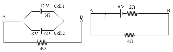 Two cells are connected between points $A$ and $B$ as shown. Cell $1$ has emf of $12\,V$ and internal resistance of $3\,\Omega$. Cell $2$ has emf of $6\,V$ and internal resistance of $6\,\Omega$. An external resistor $R$ of $4\,\Omega$ is connected across $A$ and $B$. The current flowing through $R$ will be $.............A$.