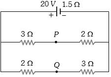 If in the circuit shown below, the internal resistance of the battery is $1.5$ $\Omega$ and $V_P$ and $V_Q$ are the potentials at $P$ and $Q$ respectively, what is the potential difference between the points $P$ and $Q$