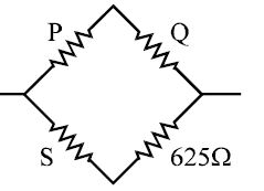 $A$ Wheatstone's bridge is balanced with a resistance of $625\, \Omega$ in the third arm, where $P, Q$ and $S$ are in the $1^{st}, 2^{nd}$ and $4^{th}$ arm respectively. If $P$ and $Q$ are interchanged, the resistance in the third arm has to be increased by $51\,\Omega$ to secure balance. The unknown resistance in the fourth arm is ............. $\Omega$