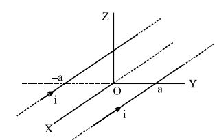 $(D)$ $\vec{B}(x, y)$ points normally outward from the $x y$-plane for all the points between the two loops