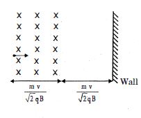 A particle of mass $m$ and charge $q$ enters a region of magnetic field (as shown) with speed $v$. There is a region in which the magnetic field is absent, as shown. The particle after entering the region collides elas tically with a rigid wall. Time after which the velocity of particle becomes anti parallel to its initial velocity is