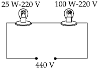 $R_{1}=\frac{V_{1}^{2}}{P_{1}}=\frac{(220)^{2}}{25} ; \quad R_{2}=\frac{V_{2}^{2}}{P}=\frac{(220)^{2}}{100}$