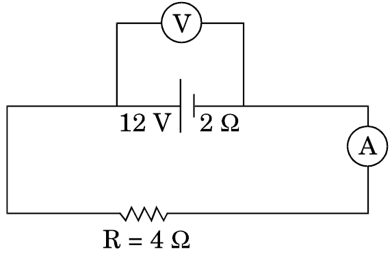 In the figure shown, an ammeter A and a resistor of $4\Omega$ are connected to the terminals of the source. The emf of the source is 12 V having an internal resistance of $2\Omega$. Calculate the voltmeter and ammeter readings.