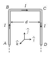 A long wire A carries a current of $10\, amp$. Another long wire $B$, Which is parallel to $A$ and separated by $0.1\,m$ from $A$, carries a current of $5\, amp$, in the opposite direction to that in $A$. what is the magnitude and nature of the force experienced per unit length of $B$ $({\mu _0} = 4\pi \times {10^{ - 7}}\,weber/amp{\rm{ - }}m)$