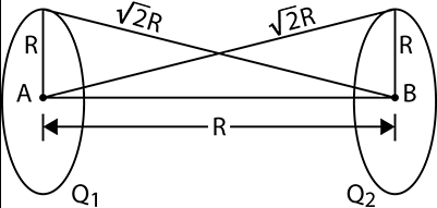 $W=\frac{q}{4 \pi \varepsilon_{0}}\left[\left(\frac{Q_{1}}{R}+\frac{Q_{2}}{\sqrt{2} R}\right)-\left(\frac{Q_{2}}{R}+\frac{Q_{1}}{\sqrt{2} R}\right)\right]$