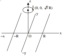 $(D)$ At the centre of the loop B due to wires is along $\mathrm{x}$-axis. Hence the z-component of the magnetic field at the center of the loop is $\left(\frac{\mu_0 I}{2 R}\right)(-\hat{k})$.