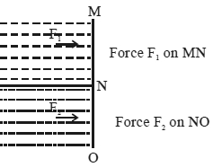 Two liquids of densities $\rho_{1}$ and $\rho_{2}\left(\rho_{2}=2 \rho_{1}\right)$ are filled up behind a square wall of side $10\; \mathrm{m}$ as shown in figure. Each liquid has a height of $5 \;\mathrm{m} .$ The ratio of the forces due to these liquids exerted on upper part $MN$ to that at the lower pait $NO$ is (Assume that the liquids are not mixing)