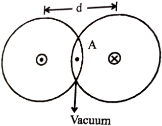 Two long conductors are arranged as shown above to form overlapping cylinders, each of raidus $r$, whose centers are separated by a distance $d$. Current of density $J$ flows into the plane of the page along the shaded part of one conductor and an equal current flows out of the plane of the page along the shaded portion of the other, as shown. What are the magnitude and direction of the magnetic field at point  $A?$
