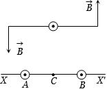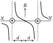 b (b) If the current flows out of the paper, the magnetic field at points to the right of the wire will be upwards and to the left will be downward. Now magnetic field at $C$, is zero. The field in the region $BX'$ will be upwards $(+ve)$ because all points lying in this region are to the right of both the wires. Similarly, magnetic field in the region $AX$ will be downwards $(-ve)$. The field in the region $AC$ will be upwards $(+ve)$ because points are closer to $A$ compared to $B$. Similarly magnetic field in region $BC$ will be downward $(-ve)$. Graph $(b)$ satisfies all these conditions.