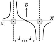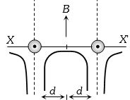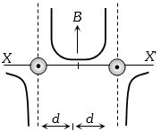 Two long parallel wires are at a distance $2d$ apart. They carry steady equal currents flowing out of the plane of the paper, as shown. The variation of the magnetic field $B$ along the line $XX’$ is given by