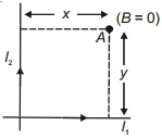 On a general point $A$ magnetic field will be zero when $\frac{\mu_0 I_2}{2 \pi x}=\frac{\mu_0 l_1}{2 \pi y}$