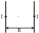 Two long straight wires, each carrying a current $I$ in opposite direction are seperated by a distance $R$ . The magnetic induction at a point midway between the wire is