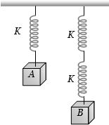 The springs shown are identical. When $A = 4kg$, the elongation of spring is $1\, cm$. If $B = 6\,kg$, the elongation produced by it is  ..... $ cm$