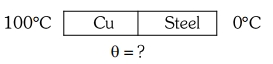 Two rods one made of copper and other made of steel of the same length and same cross sectional area are joined together. The thermal conductivity of copper and steel are $385\,J\,s ^{-1}\,K ^{-1}\,m ^{-1}$ and $50\,J\,s ^{-1}\,K ^{-1}\,m ^{-1}$ respectively. The free ends of copper and steel are held at $100^{\circ}\,C$ and $0^{\circ}\,C$ respectively. The temperature at the junction is, nearly $.......^{\circ}\,C$