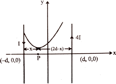 Two very long straight parallel wires, parallel to $y-$ axis,carrycurrents $4I$ and $I,$ along $+y$ directionand$-y$ direction, respectively. The wires are passes through the $x-$axis at the points $(d, 0, 0)$ and $(- d, 0, 0)$ respectively.The graph of magnetic field $z-$component as one moves along the $x-$axis from $x=- d$ to $x= +d,$ is best given by