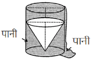 बेलन में बचे पानी का आयतन $=$ एक बेलन में पानी का कुल आयतन $-$ ठोस शंकु रखने पर बेलन से गिराए गए पानी का आयतन
