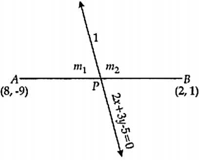 $P(x, y) AB$ को $m_1 : m_2$ अथवा $A(8, - 9) : B(2, 1)$ के अनुपात में विभाजित करता है