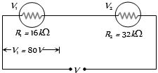 Current flowing through ${V_1}$$=$ Current flowing through ${V_2}$ $=$ $\frac{{80}}{{16 \times {{10}^3}}} = 5 \times {10^{ - 3}}\,A$.