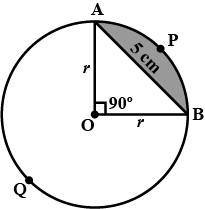 जीवा $AB = 5$ सेमी वृत्त को दो खंडों लघु खंड $\text{APB}$ और प्रमुख खंड $\text{AQB}$ में विभाजित करता है। हमें बड़े और छोटे खंड के क्षेत्रफल में अंतर का पता लगाना है।