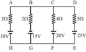 In the electric network shown, when no current flows through the $4\, \Omega $ resistor in the arm $EB$, the potential difference between the points $A$ and $D$ will be ............... $V$
