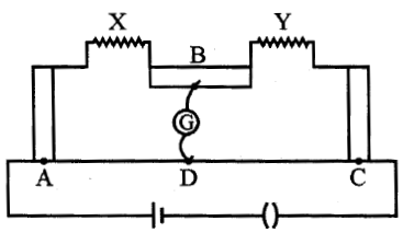 The figure shows experimental set up of a meter bridge. When the two unknown resistances X and Y are inserted, the null point D is obtained 40 cm from the end A. When a resistance of 10 Ω is connected in series with X, the null point shifts by 10 cm. Find the position of the null point when the 10 Ω resistance is instead connected in series with resistance ‘Y’. Determine the values of the resistances X and Y.