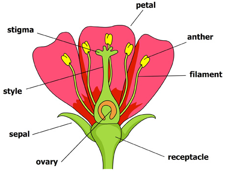 The main female reproductive parts are the carpels, which are fused together in most flowers to form a pistil. The pistil is usually found in the center of the flower, and is essentially a home for the ovules, or eggs. A pistil has three parts: a sticky part at the top called a stigma, the thin tube leading downward called a style, and the sac at the bottom called an ovary. When the pollen, which is the male gamete (corresponding to sperm in animals), reaches the pistil, it often becomes stuck to the stigma. The pollen then travels down the style into the ovary, where it meets with the ovules and fertilizes them.