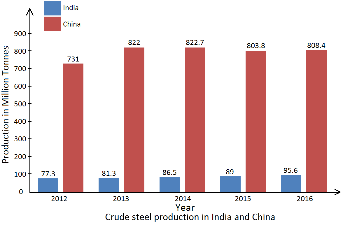 What is the status of India and China in steel production? Explain it with an appropriate graph.