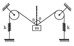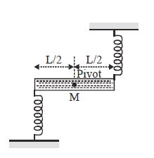 A uniform stick of mass $M$ and length $L$ is pivoted at its centre. Its ends are tied to two springs each of force constant $K$ . In the position shown in figure, the strings are in their natural length. When the stick is displaced through a small angle $\theta $ and released. The stick